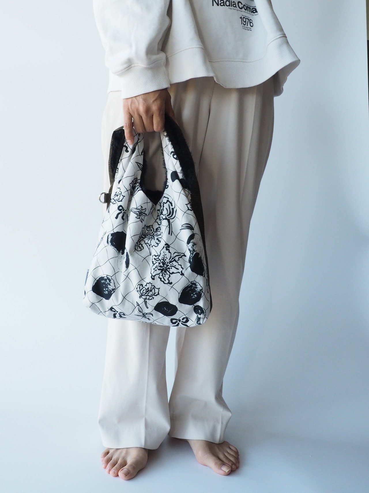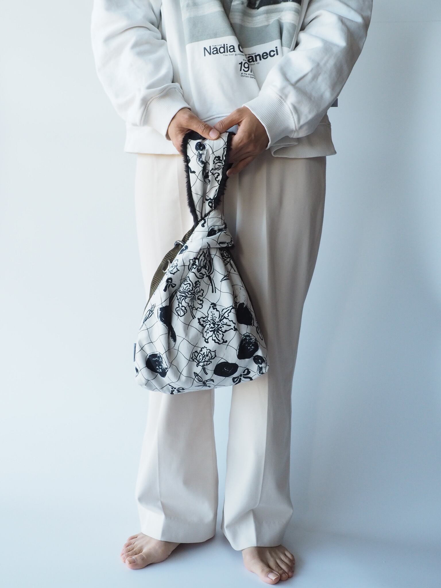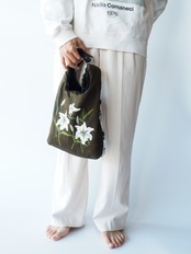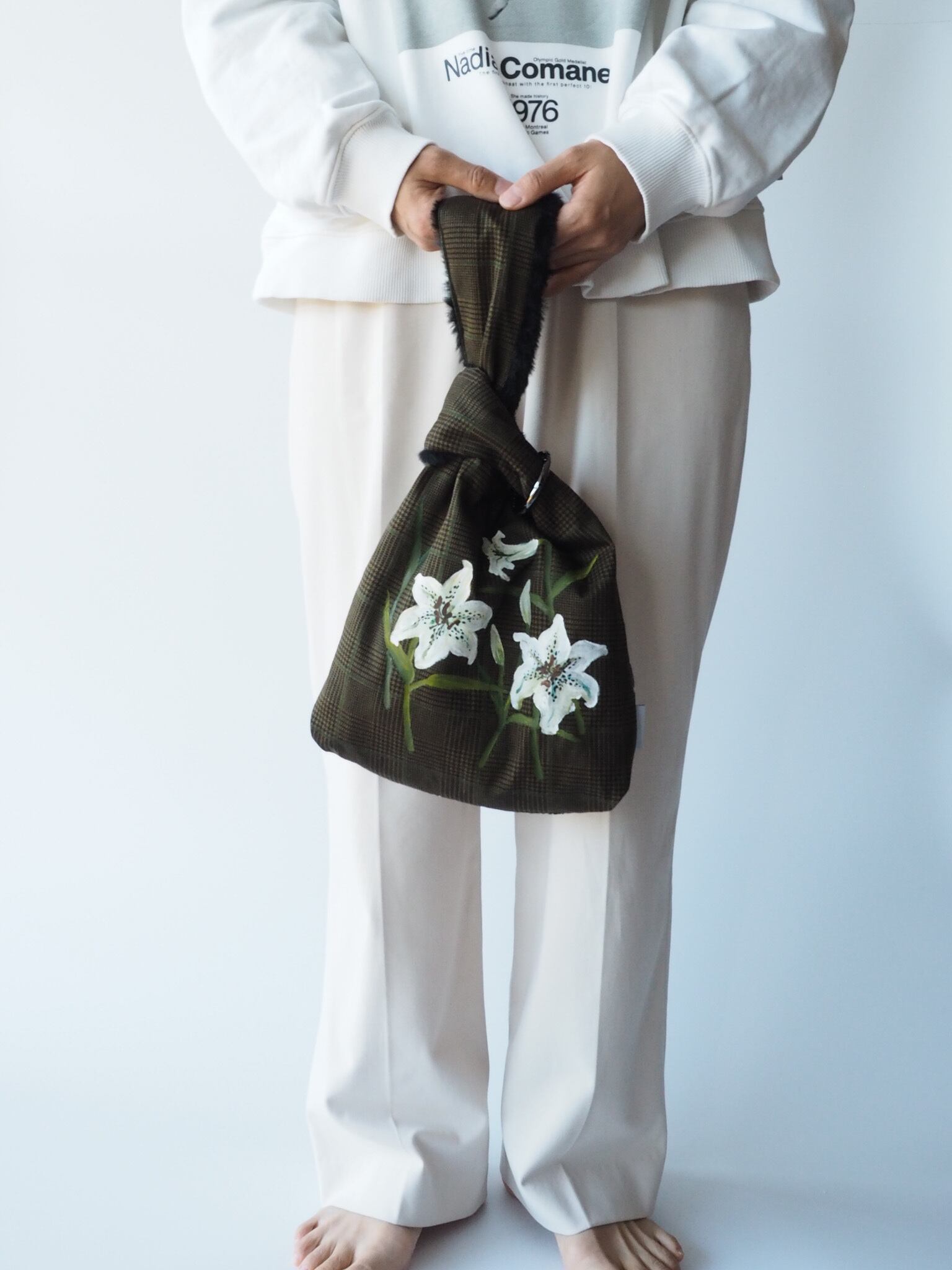 アートを主役に: チェック&フラワーの面を表にして、コーディネートのアクセントに。